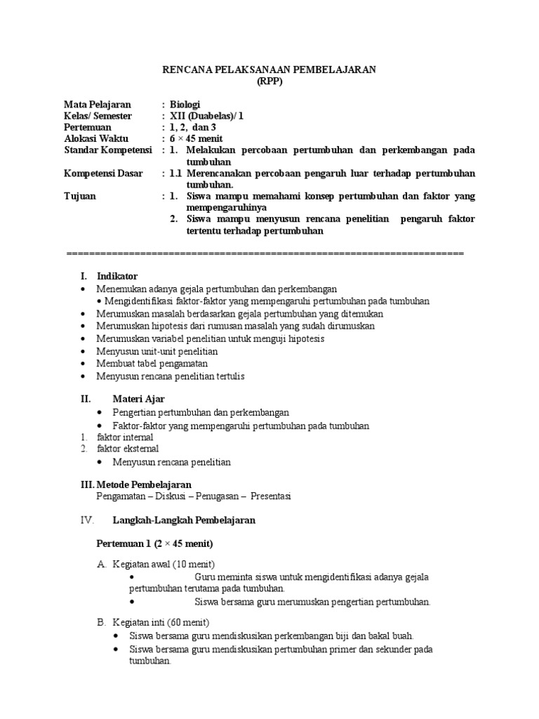 Rpp Biologi Kelas Xii Sk 1 Kd 1 2 Pertemuan I Pertumbuhan Dan Pe